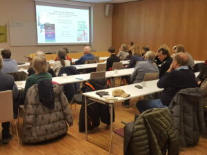 Under rubriken ”Den nödvändiga omställningen” utmanade Staffan Laestadius, professor emeritus i nationalekonomi vid KTH, i sitt föredrag etablerade föreställningar om vad som är  realistiskt. Hans budskap var (och är!) att den postfossila morgondagen kan och måste byggas här och nu, med teknik som redan finns runt omkring oss! Om detta handlar också hans nya bok ”Större än du nånsin tror. Klimatkrisen och den nödvändiga omställningen”, vilken fanns till försäljning efter föredraget – och som hade en strykande åtgång.