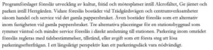 Dokumentets omfång ger intryck av en väldigt djupgående redovisning av konkreta riktlinjer för arbetet. Dock utgörs huvuddelen av en faktaredovisning av styrande lagar, nationella miljömål, länsstyrelsens handlingsplan, förutsättningar vad avser Nykvarns geologi och natur, med mera. Vi menar att programmet för att verkligen utgöra ett ”program”, i den meningen att det kan utgöra en reell handlingsplan, borde vara mer bestämt t ex vad gäller konkreta åtgärder. De mål och riktlinjer för naturvård som anges är bra, men de är ofta allför vaga för att ha verklig betydelse om de utmanas vid t ex detaljplanläggning. Många är öppna för (egna) tolkningar som passar egna syften och önskemål. Vi efterlyser distinkta regler alternativt definitioner och specifikationer.