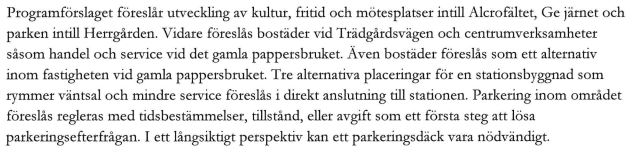 Beträffande Mörby så menar vi att detta stora område är alltför styvmoderligt avhandlat i förslaget. Här saknas preciseringar om allt från byggnaders lokalisering, utseenden, arkitektur, nåbarhet med mera till hänsyn till natur och miljö, infrastruktur, gång- och cykelvägar, kollektivtrafik med mera. Kanske av rädsla för att det ska avskräcka företag att etablera sig här? Vi menar att sådan rädsla är obefogad – åtminstone förutsatt framåtsyftande planering, som ger området status istället för att ge det intryck av ett ”tråkigt”, gammaldags industriområde.